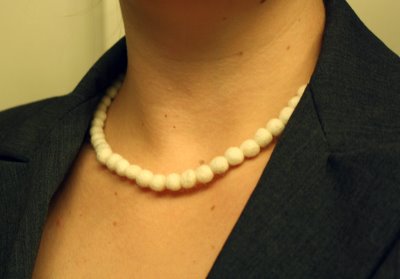 I had an idea in 2009 to create an imitation pearl necklace using natural white wool. Every woman in western culture recognizes the showing of status, wealth and sophistication that accompanies a pearl necklace. This piece gives a similar impression yet upon further investigation the extreme contrast in texture and luster to actual pearls may leave the viewer feeling cheated.